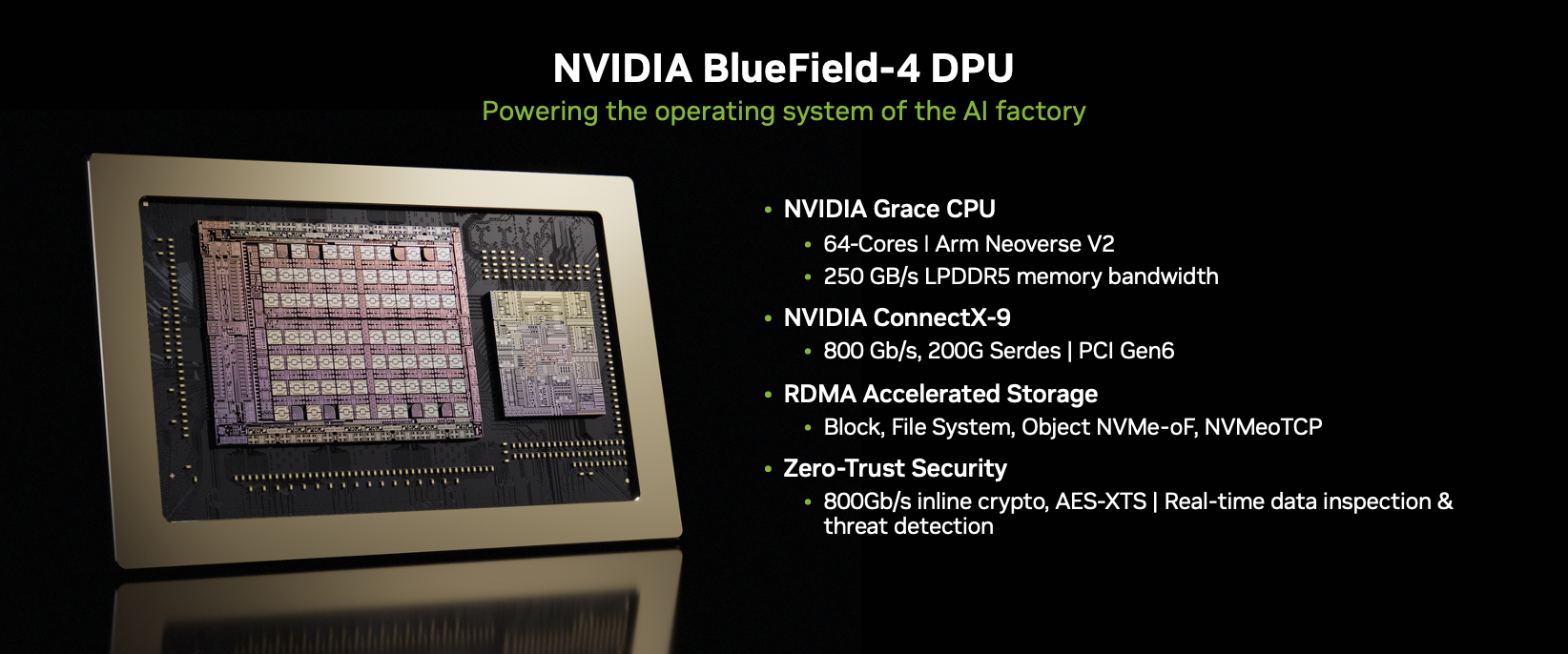 高速網路介面——BlueField-4 支援最高 800G Ethernet 或 InfiniBand,是資料進出伺服器的物理入口。